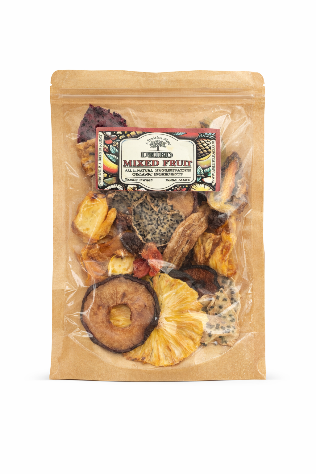 This is a magnificent collection of A Fruitful Place Dried Fruits. Our Mixed Fruit assortment showcases the finest selection of our dried fruit offerings, including apple, coconut, papaya, strawberry, mango, pineapple, pears, grapes, kiwi, dragon fruit, jackfruit, mandarin, plums, and more.