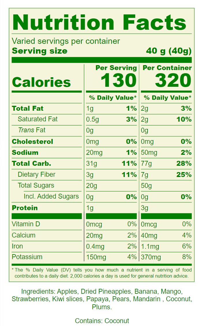 Ingredients: Apples, Dried Pineapples, Banana, Mango, Strawberries, Kiwi Slices, Papaya, Pears, Mandarin, Coconut, Plums.